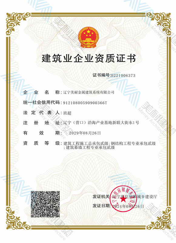 遼寧美耐金屬建筑系統(tǒng)有限公司位于遼寧(營口)沿海產(chǎn)業(yè)基地,專注于預(yù)制金屬建筑系統(tǒng)領(lǐng)域,是一家集工業(yè)建筑設(shè)計、制作、施工及相關(guān)的技術(shù)咨詢與服務(wù)為一體的綜合性服務(wù)企業(yè)。作為國家鋼結(jié)構(gòu)協(xié)會會員、中國建筑金屬結(jié)構(gòu)協(xié)會會員單位與國家高新技術(shù)企業(yè),美耐建筑集建筑工程施工總承包、鋼結(jié)構(gòu)工程專業(yè)承包等多種資質(zhì)于一身,并擁有22項鋼結(jié)構(gòu)建筑領(lǐng)域?qū)@?項軟件著作權(quán)。